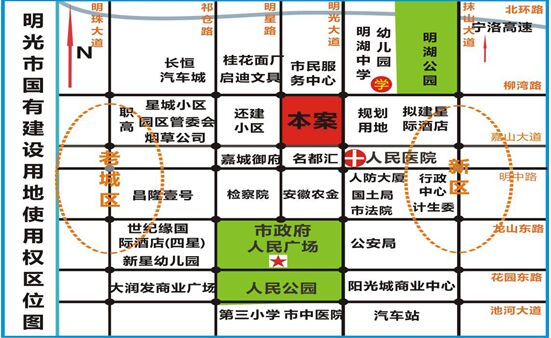 【项目介绍】地块位于明光市城东新区明光大道与柳湾路交叉口,土地面积66.5亩,土地用途为商住用地,其中包括50.89亩居住用地,1.0≤r≤2.2,绿地率≥20%,和15.64亩商业用地,1.0≤r≤1.8,绿地率≥30%,参考价70万/亩。 【项目优势】项目区位优势明显,四面临路,周边配套完善。紧临城东新区最好的九年一贯制学校明湖中学,离明光市人民医院200米,新区配套完善,学校、医院、商业、市政、政务等,项目离老城区仅5分钟车程。周边房价4000元/平方米左右。 【周边配套】1.学校配套:明光中学新校区、明湖中学、明湖幼儿园、明光职业技术学校等优质教育资源均在项目周边2公里以内。其中明湖中学是九年一贯制学校,于2015年12月竣工,学生规模将达到3000人,东侧的幼儿园是城东新区最好的幼儿园。 2.医院配套:明光市人民医院、星城医院。其中明光市人民医院是一所二级甲等综合医院,也是明光市医保人员、新农合、城镇医保、女职工生育保险定点就诊单位,是蚌埠医学院、滁州卫校教学医院。 3.商业配套:大润发、正元广场等。 4.公园配套:龙湖公园、市人民公园。 5.市政配套:明光市人民政府、机关单位、市行政服务中心、市公安局、市法院、市烟草局等。