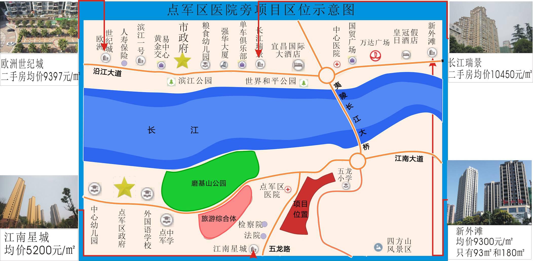 项目简介 居住用地两块总面积约214亩,参考容积率不大于2.8(可调整),楼面价约1000元/㎡;商业用地面积约52亩,参考容积率不大于5.0(可调整)楼面价约700元/㎡.;其他的规划条件还未定,政府具体可根据投资人意见来确定。 优势: 区域优势:项目与万达商圈核心位置隔江相望,万达商圈周边楼盘均价约在10000元/㎡左右,与之隔江相望的江南星城均价5200元/㎡,差距较大,同时潜力也极大。 交通配套优势:项目位于夷陵长江大桥下桥左转(夷陵长江大桥是目前唯一一座点军区通车到宜昌市的主干道),五龙一路修通后可连接江南大道和即将建成的至喜长江大桥(起于点军区规划的东岳二路,沿线跨江南大道、318线、长江、西坝区、三江、沿江大道,止于西陵区西陵二路,全长3.23公里。投资27.5亿元,预计2015年底通车)。 商业配套:万达商业广场、磨基山旅游综合体。 教育配套:点军中学、外国语学校、点军幼儿园、五龙路小学。 公园配套:磨基山森林公园。 生活配套:点军区人民医院、湖北银行、农业银行、菜市场、邮局。