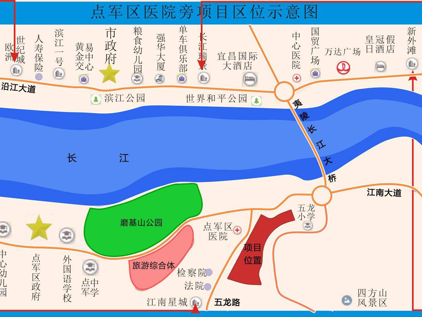 4、地块周边,行政机关聚集;距离地块不远即是长江江堤和全民健身体育中心。新老城区资源共享,人口密度大,“文卫体教”各种要素一应俱全,人气旺盛,极具开发价值。